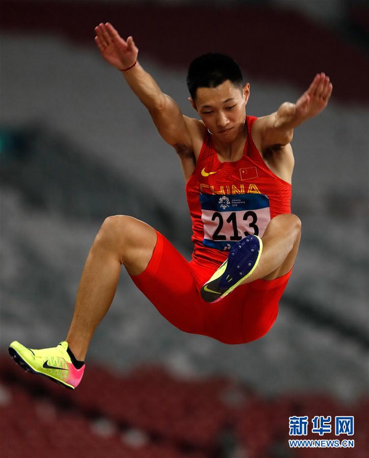 8月26日,中国选手王嘉男在比赛中。 当日,在印度尼西亚雅加达举行的第18届亚运会田径男子跳远决赛中,中国选手王嘉男以8米24的成绩夺冠,中国选手张耀广以8米15的成绩获得亚军。 新华社记者王丽莉摄