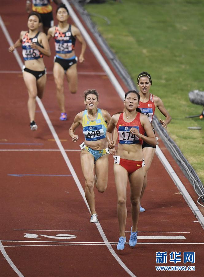 8月28日,中国选手王春雨(前)在比赛中。 当日,在第18届亚运会田径女子800米决赛中,中国选手王春雨以2分01秒80的成绩夺冠。 新华社记者黄宗治摄