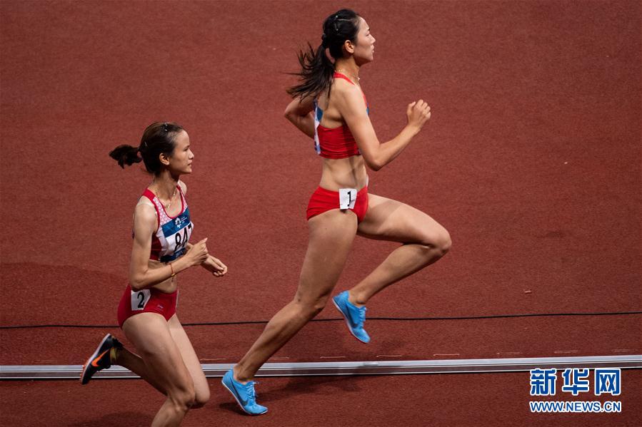 8月28日,中国选手王春雨(右)在比赛中。 当日,在第18届亚运会田径女子800米决赛中,中国选手王春雨以2分01秒80的成绩夺冠。 新华社记者张金加摄