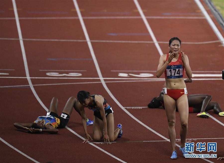 8月28日,中国选手王春雨(右)在比赛后。 当日,在第18届亚运会田径女子800米决赛中,中国选手王春雨以2分01秒80的成绩夺冠。 新华社记者黄宗治摄