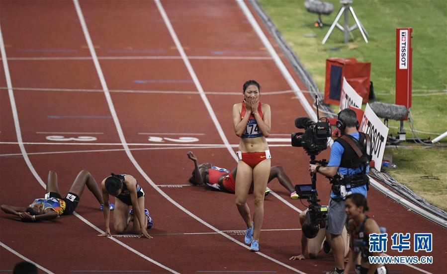 8月28日,中国选手王春雨在比赛后。 当日,在第18届亚运会田径女子800米决赛中,中国选手王春雨以2分01秒80的成绩夺冠。 新华社记者黄宗治摄