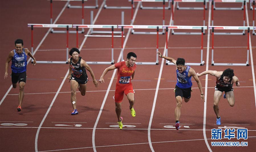8月28日,中国选手谢文骏(左三)在比赛中。 当日,在第18届亚运会男子110米栏决赛中,中国选手谢文骏以13秒34的成绩获得冠军。 新华社记者黄宗治摄