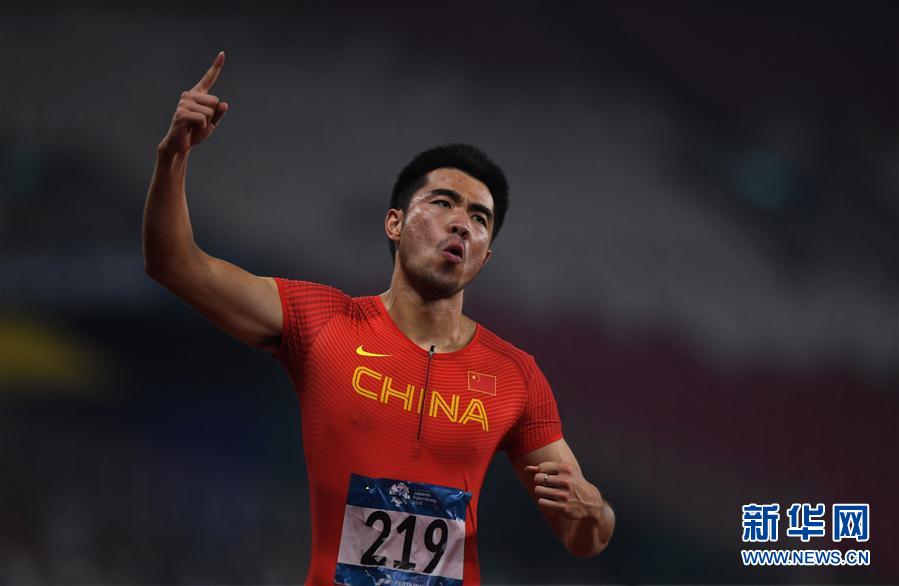 8月28日,中国选手谢文骏在比赛后庆祝。 当日,在第18届亚运会男子110米栏决赛中,中国选手谢文骏以13秒34的成绩获得冠军。 新华社记者潘昱龙摄