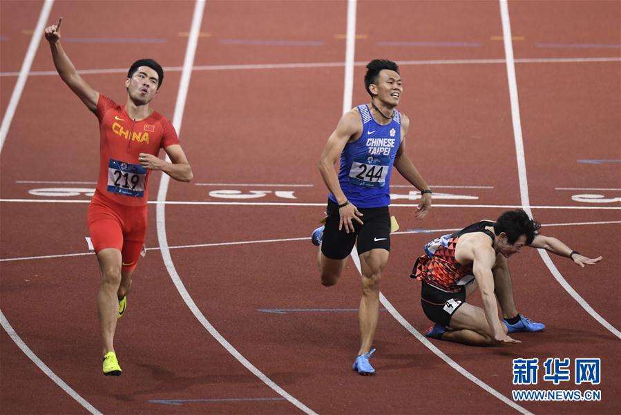 8月28日,中国选手谢文骏(左)在比赛后庆祝。 当日,在第18届亚运会男子110米栏决赛中,中国选手谢文骏以13秒34的成绩获得冠军。 新华社记者黄宗治摄
