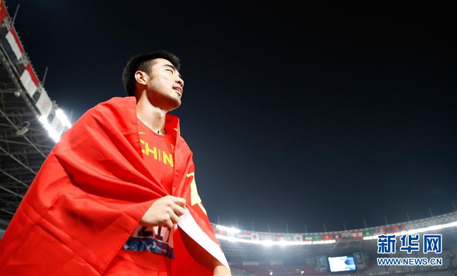 8月28日,中国选手谢文骏在比赛后庆祝。 当日,在第18届亚运会男子110米栏决赛中,中国选手谢文骏以13秒34的成绩获得冠军。 新华社记者王丽莉摄