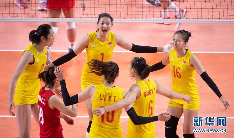 8月29日,中国队球员在比赛中庆祝得分。 当日,在第18届亚运会女子排球四分之一决赛中,中国队以3比0战胜菲律宾队。 新华社记者张金加摄