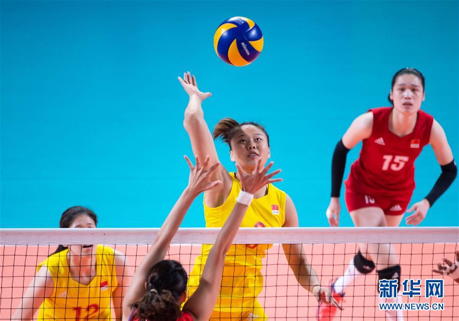 8月29日,中国队球员龚翔宇(右二)在比赛中进攻。 当日,在第18届亚运会女子排球四分之一决赛中,中国队以3比0战胜菲律宾队。 新华社记者张金加摄
