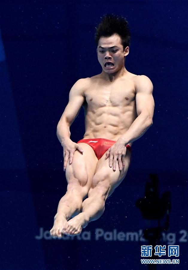 8月30日,中国选手彭健烽在比赛中。 当日,在第18届亚运会跳水男子1米跳板决赛中,中国选手彭健烽以462.15分的成绩获得冠军。 新华社记者岳月伟摄