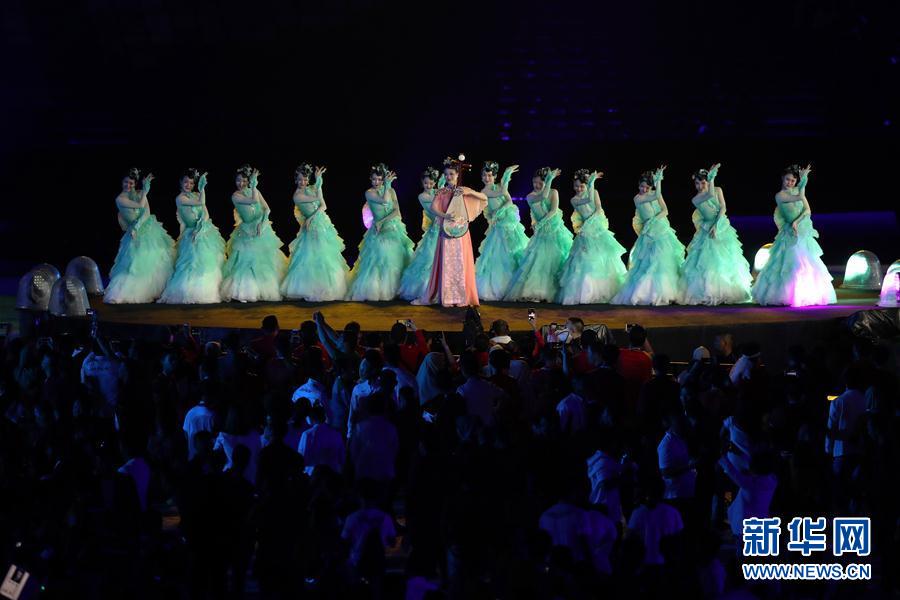 ↑9月2日,第18届亚运会闭幕式在印度尼西亚雅加达举行。 这是闭幕式上的“杭州时间”文艺演出。 新华社记者张金加摄