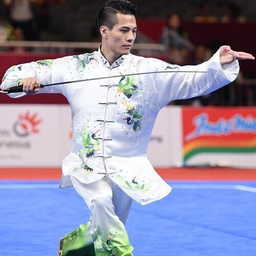 8月22日,中国选手陈洲理在男子太极剑比赛中。 当日,在第18届亚运会武术男子太极拳太极剑全能比赛中,中国选手陈洲理获得冠军。