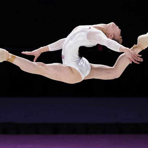8月22日,中国队选手章瑾在女团自由操比赛中。 当日,在印度尼西亚雅加达举行的第18届亚运会体操女子团体决赛中,中国队以165.250分的总成绩获得冠军。