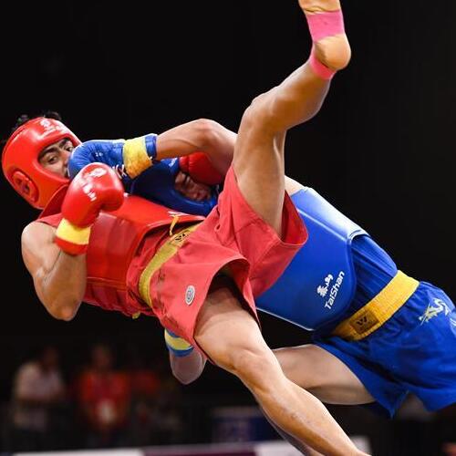 8月22日,中国选手李勐凡(右)在比赛中。 当日,在第18届亚运会男子散打65公斤以下半决赛中,中国选手李勐凡以2比0战胜阿富汗选手霍塔克。