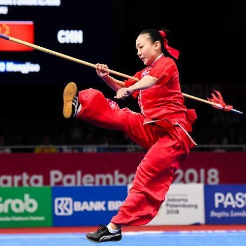 8月21日,雅加达亚运会武术女子剑术枪术全能之枪术决赛,中国选手郭梦娇得分9.74,总分19.49夺金。