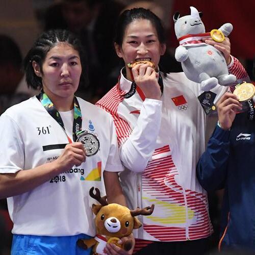 8月21日,中国选手周倩(下)在比赛中。 当日,在第18届亚运会摔跤女子自由式76公斤级决赛中,中国选手周倩以8比0战胜日本选手皆川博惠,获得金牌。
