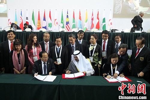 资料图:第31届亚奥理事会全体代表大会2012年11月8日在澳门举行。经大会投票,2019年第18届夏季亚洲运动会主办地落户越南河内。图为亚奥理事会与越南代表团签订举办协议。中新社发 龙土有 摄