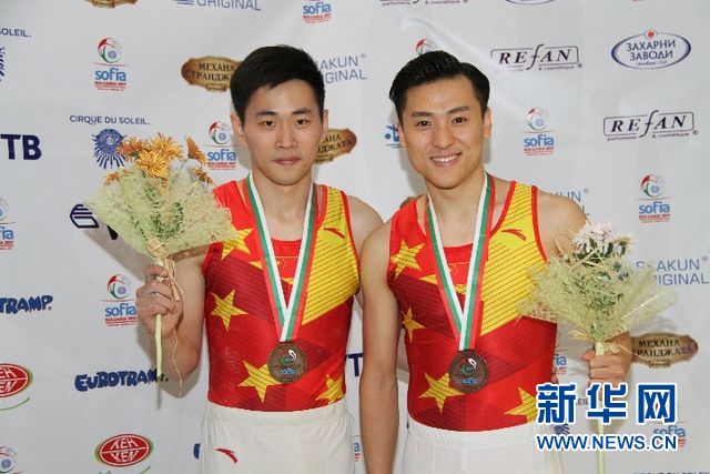 在2017蹦床世界锦标赛上,高磊(左)和董栋分别获得冠军和季军。新华社记者战小漪摄