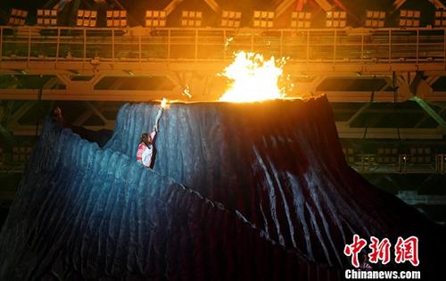 最终,王莲香来到主舞台的火山之顶,将位于火山口的主火炬点燃。一瞬间,亚运圣火如同火山喷发,全场气氛也被带向高潮。