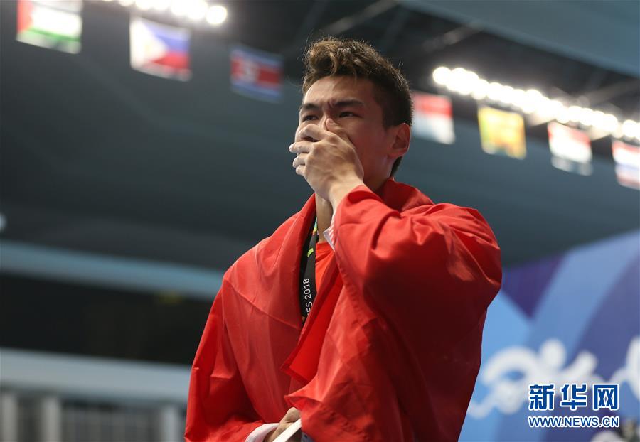 ↑ 8月19日,中国选手徐嘉余在颁奖仪式后。 当日,在第18届亚运会男子100米仰泳决赛中,中国选手徐嘉余以52秒34的成绩夺冠。新华社记者丁汀摄