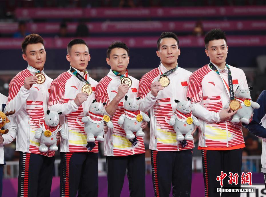 当地时间8月22日进行的雅加达亚运会男子体操团体赛争夺中,以肖若腾、林超攀、邹敬园、邓书弟、孙炜组成的中国队以总成绩260.950分成功战胜日本,收获冠军。四年前的仁川亚运会,中国队男团十连冠被日本队终结。中新社记者 刘关关 摄