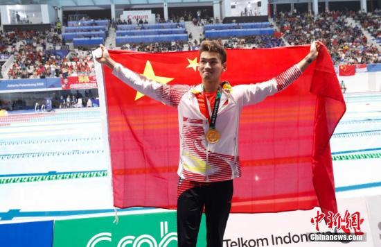 雅加达亚运会男子100米仰泳,徐嘉余夺金。赛后徐嘉余高扬国旗庆祝胜利。中新社记者 杜洋 摄