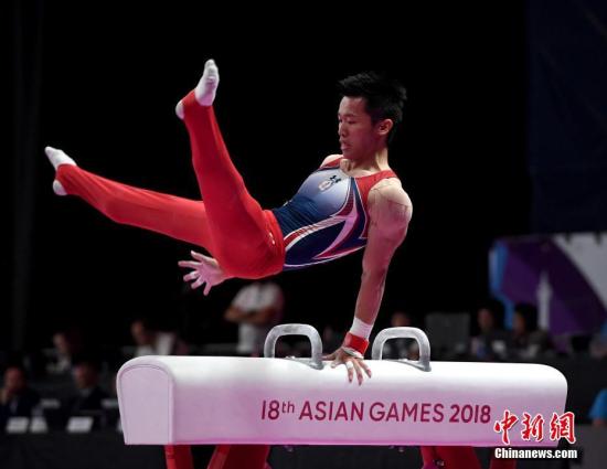 8月23日,雅加达亚运会男子鞍马决赛,中国台北选手李智凯以15.400分夺冠,这是中国台北代表团在亚运会体操历史上的首枚金牌。中国选手邹敬园、孙炜分获二、三名。图为李智凯在比赛中。中新社记者 侯宇 摄
