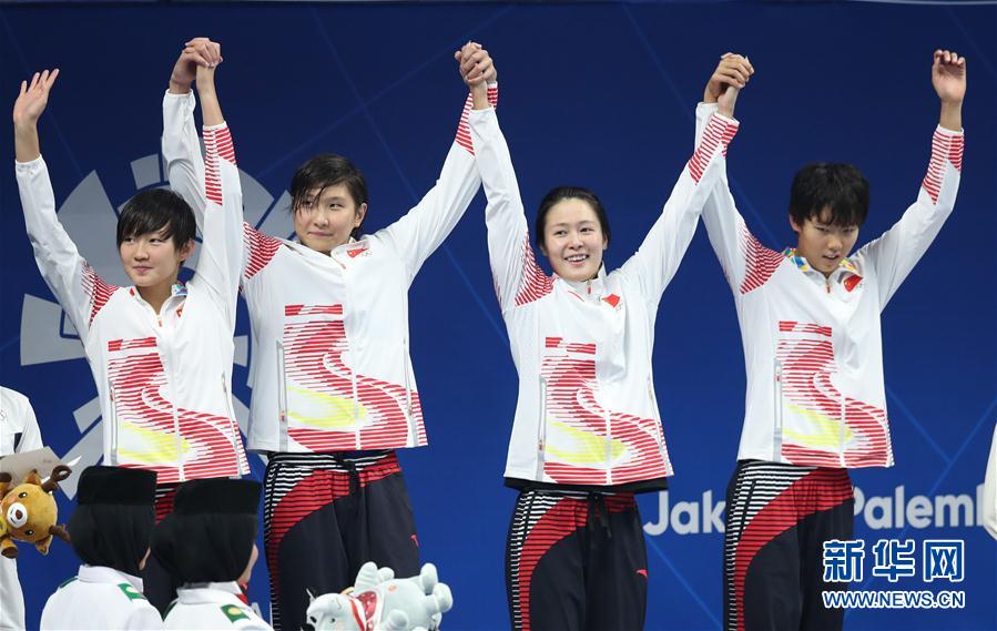 8月24日,第18届雅加达亚运会游泳比赛收官。在六个比赛日中,中国泳坛健儿劈波斩浪收获19枚金牌,与另一支传统强队日本队平分秋色,两队瓜分了游泳项目全部41枚金牌中的大半。中国游泳队用优异的战绩为祖国赢得了荣誉。 图为8月21日,中国队选手李冰洁、王简嘉禾、张雨涵和杨浚瑄(从左至右)在女子4X200米自由泳接力颁奖仪式上。中国队7分48秒61的成绩夺冠。 新华社记者丁汀摄