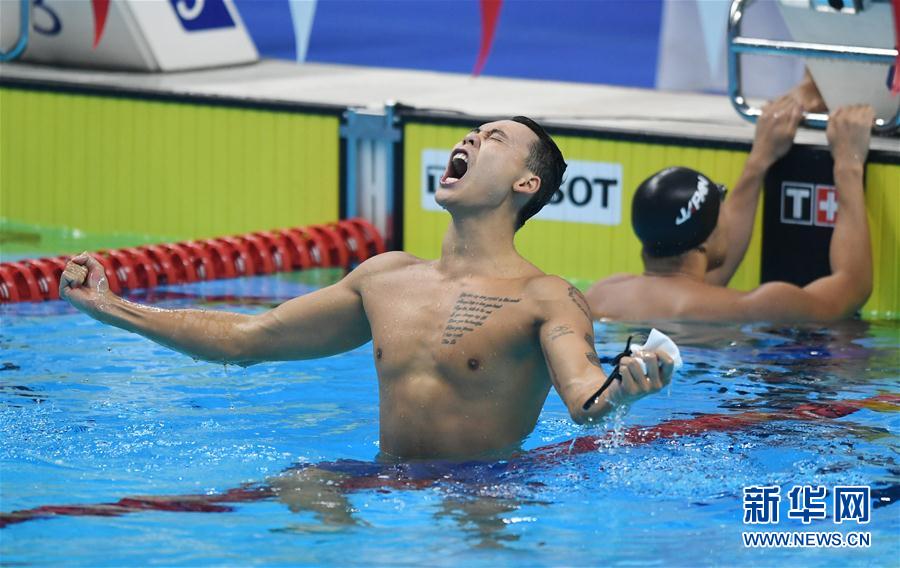 8月24日,第18届雅加达亚运会游泳比赛收官。在六个比赛日中,中国泳坛健儿劈波斩浪收获19枚金牌,与另一支传统强队日本队平分秋色,两队瓜分了游泳项目全部41枚金牌中的大半。中国游泳队用优异的战绩为祖国赢得了荣誉。 图为8月24日,中国队选手余贺新在男子4X100米混合泳接力决赛后庆祝。中国队选手徐嘉余、闫子贝、李朱濠和余贺新以3分29秒99的成绩夺冠。 新华社记者岳月伟摄