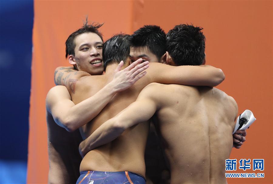 8月24日,第18届雅加达亚运会游泳比赛收官。在六个比赛日中,中国泳坛健儿劈波斩浪收获19枚金牌,与另一支传统强队日本队平分秋色,两队瓜分了游泳项目全部41枚金牌中的大半。中国游泳队用优异的战绩为祖国赢得了荣誉。 图为8月24日,中国队选手在男子4X100米混合泳接力决赛后庆祝夺冠。中国队选手徐嘉余、闫子贝、李朱濠和余贺新以3分29秒99的成绩夺冠。 新华社记者费茂华摄