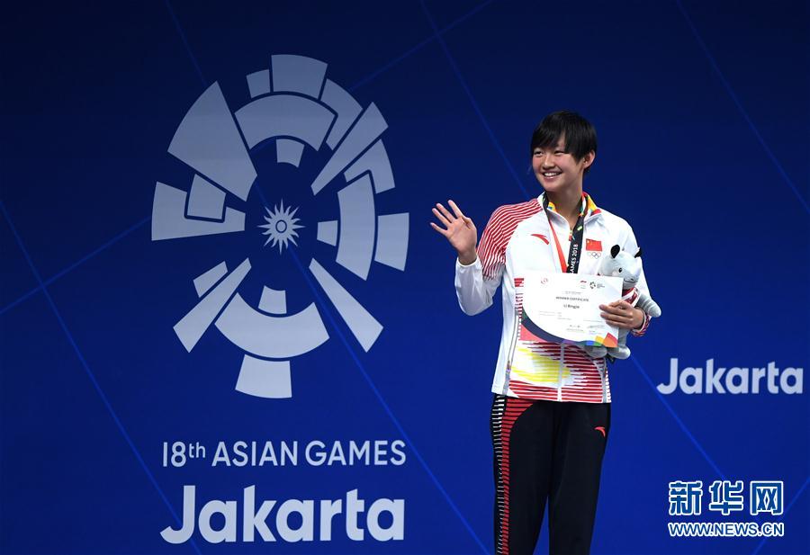 8月24日,第18届雅加达亚运会游泳比赛收官。在六个比赛日中,中国泳坛健儿劈波斩浪收获19枚金牌,与另一支传统强队日本队平分秋色,两队瓜分了游泳项目全部41枚金牌中的大半。中国游泳队用优异的战绩为祖国赢得了荣誉。 图为8月22日,中国选手李冰洁在女子200米自由泳颁奖仪式上。她以1分56秒74的成绩夺冠。 新华社记者潘昱龙摄