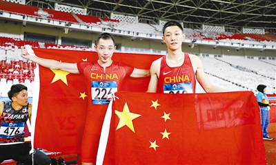 8月26日,在田径男子跳远决赛中,中国选手王嘉男(右)以8米24的成绩夺冠,张耀广以8米15的成绩获得亚军。新华社记者 王丽莉 摄