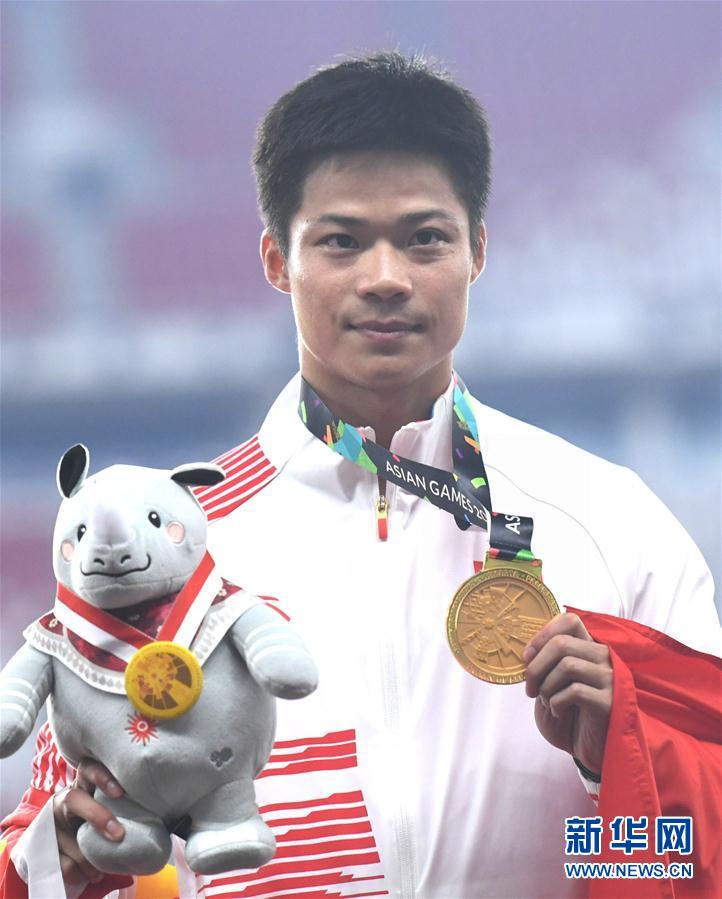 这是2018年8月26日,中国选手苏炳添在第18届亚运会田径男子100米颁奖仪式上。 新华社记者岳月伟摄