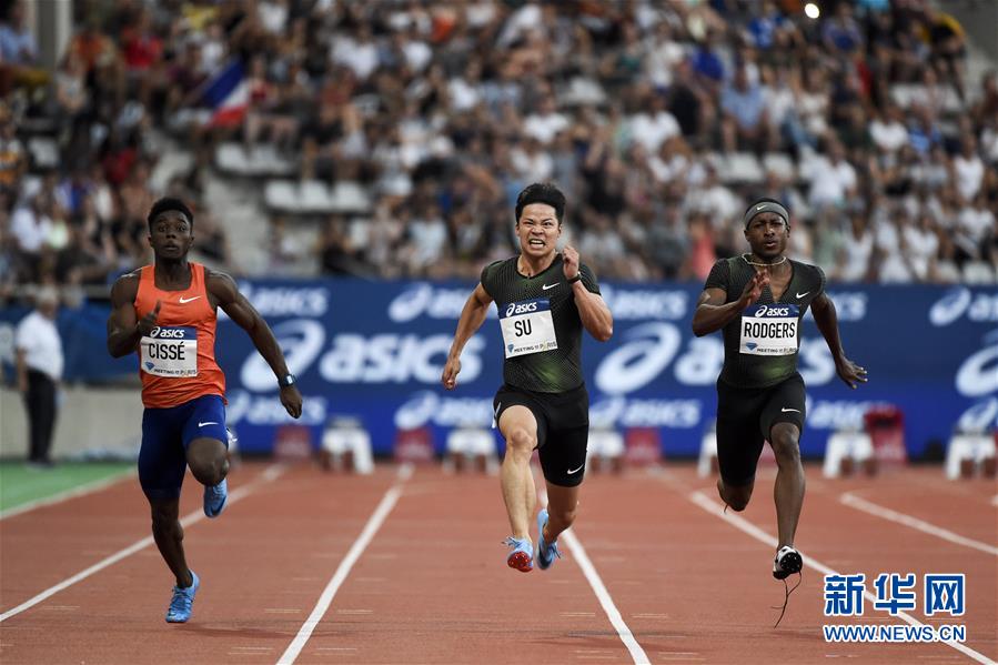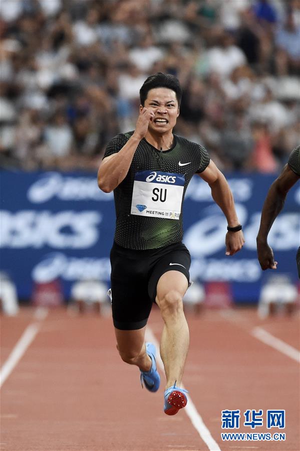 这是2018年6月30日,中国选手苏炳添在法国巴黎举行的国际田联钻石联赛巴黎站男子100米决赛中,苏炳添再次跑出9秒91的个人最好成绩,获得本站第三名,这是他9天之内两平亚洲纪录。 新华社发(让-马里·埃尔维奥摄)