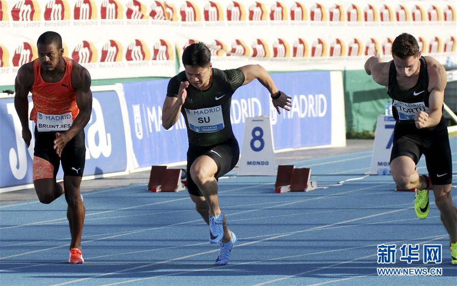 这是2018年6月22日,中国选手苏炳添(中)在国际田联世界田径挑战赛马德里站预赛中。 新华社发(爱德华·洛佩斯摄)