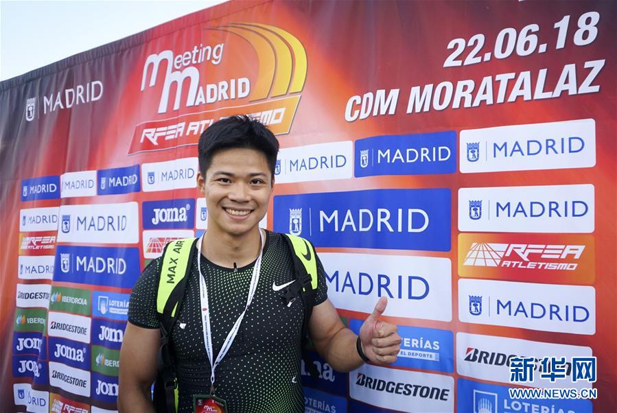 这是2018年6月22日,中国选手苏炳添在西班牙马德里举行的国际田联世界田径挑战赛马德里站比赛后。苏炳添在本站赛中跑出9秒91的个人最好成绩。 新华社发(中国田径协会供图)