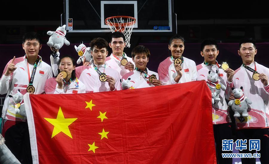 8月26日,中国队选球员黄文威(右一)在夺冠后倒地庆祝。 当日,在第18届亚运会男子三人篮球决赛中,中国队以19比18战胜韩国队,获得冠军。 新华社记者李响摄