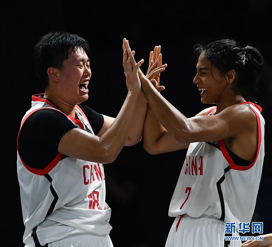 8月26日,中国队球员张芷婷(左)和迪拉娜·迪里夏提在夺冠后庆祝。 当日,在第18届亚运会女子三人篮球决赛中,中国队以21比10战胜日本队,获得冠军。 新华社记者李响摄
