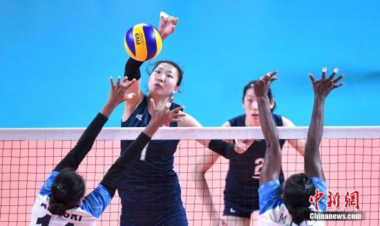 8月27日,中国女排迎来亚运会小组赛收官战,对手是印度队。中国女排以25:18,25:19和25:9直落3局,中国女排5战全胜以小组第一的身份晋级亚运会8强。中新社记者 李霈韵 摄
