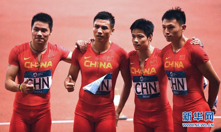 8月29日,中国队选手徐海洋、糜弘、苏炳添和许周政(从左至右)在比赛后。 当日,在第18届亚运会田径男子4X100米预赛中,中国队以38秒88的成绩晋级决赛。 新华社记者李贺摄