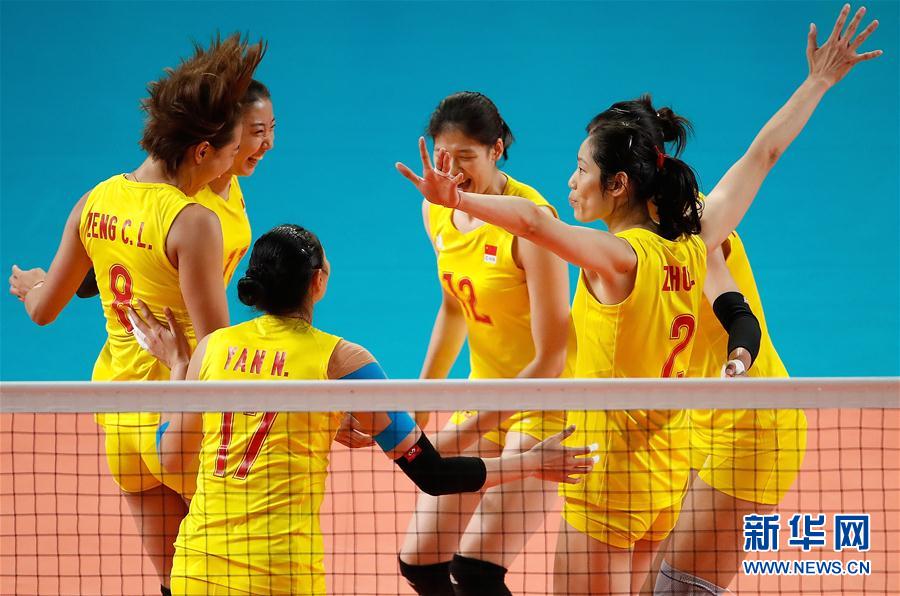 8月31日,中国队球员在比赛中庆祝得分。 当日,在第18届亚运会女子排球半决赛中,中国队以3比0战胜日本队,晋级决赛。 新华社记者王丽莉摄
