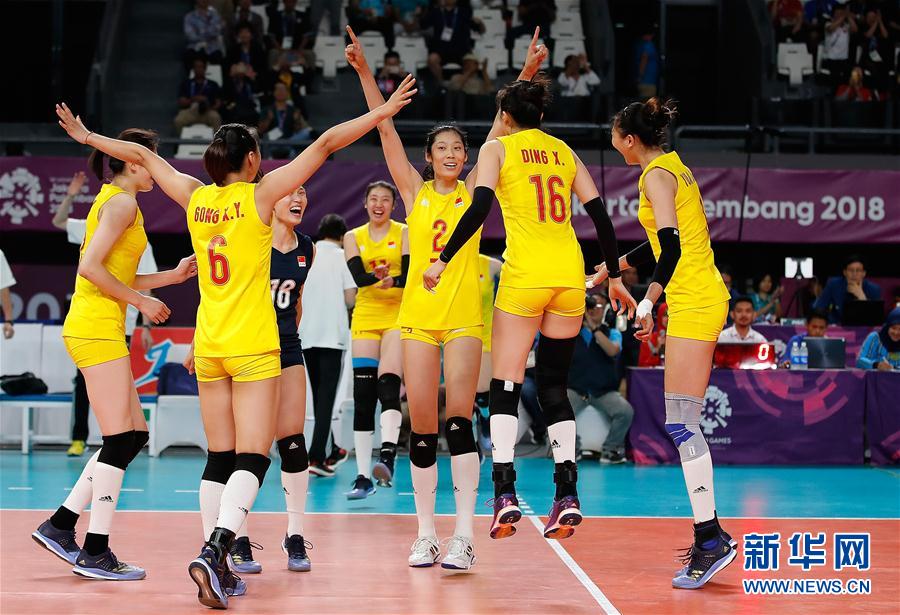 8月31日,中国队球员在赛后庆祝。 当日,在第18届亚运会女子排球半决赛中,中国队以3比0战胜日本队,晋级决赛。 新华社记者王丽莉摄
