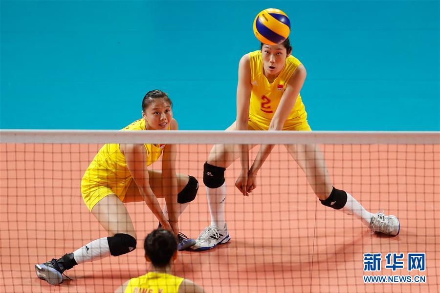 8月31日,中国队球员朱婷(右)在比赛中。 当日,在第18届亚运会女子排球半决赛中,中国队以3比0战胜日本队,晋级决赛。 新华社记者王丽莉摄