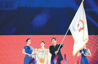 图为闭幕式上的亚奥理事会会旗交接仪式。