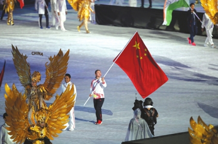 中国体育代表团旗手郭丹在闭幕式上入场。