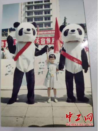 1990年,笔者在北京民族文化宫广场前和亚运会吉祥物“盼盼”合影留念