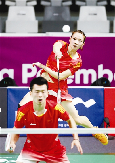 郑思维/黄雅琼(上)在比赛中。新华社记者 丁汀 摄