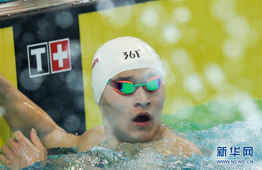 8月19日,孙杨在赛后查看成绩。新华社记者丁汀摄