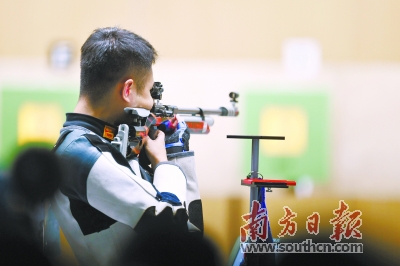 在亚运会男子10米气步枪决赛中,中国选手杨皓然打破赛会纪录夺冠。 新华社发