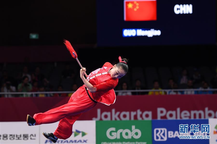 ↑8月21日,中国选手郭梦娇在枪术项目比赛中。 当日,在第18届亚运会武术女子剑术枪术全能比赛中,中国选手郭梦娇获得冠军。 新华社记者张金加摄