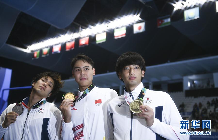 8月21日,中国选手余贺新(中)在颁奖仪式上。 当日,在第18届亚运会男子50米自由泳决赛中,中国选手余贺新以22秒11的成绩夺冠。 新华社记者李响摄
