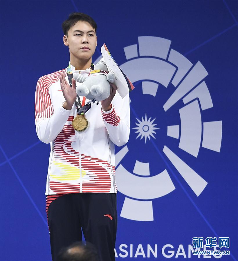 8月21日,中国选手余贺新在颁奖仪式上。 当日,在第18届亚运会男子50米自由泳决赛中,中国选手余贺新以22秒11的成绩夺冠。 新华社记者李响摄